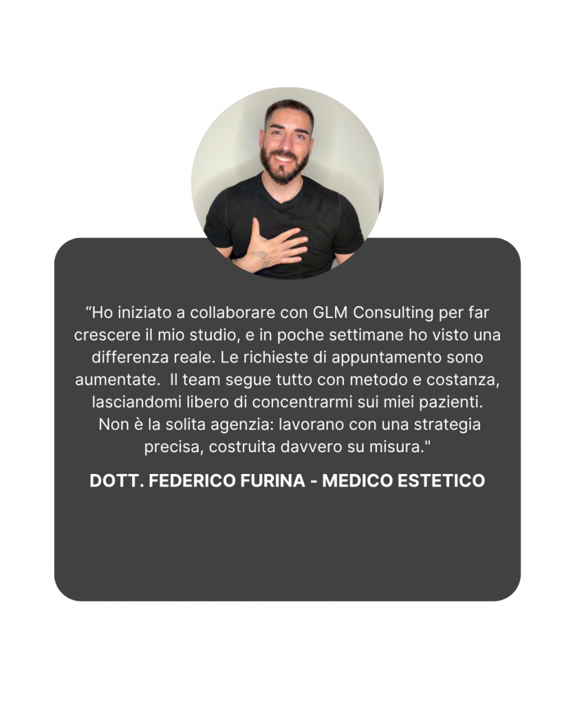 Ogni studio che ha scelto il metodo #FollaDiClienti ha visto crescere in modo concreto il numero di pazienti, già nelle prime due settimane di lavoro. Le agende si riempiono, le richieste di informazioni aumentano e i professionisti tornano a concentrarsi su ciò che sanno fare meglio: prendersi cura dei propri pazienti. Non si tratta di promesse o numeri astratti, ma di risultati reali che puoi percepire direttamente nel tuo studio, giorno dopo giorno. Campagne mirate, comunicazione chiara e strategie su misura: questo è ciò che fa la differenza.